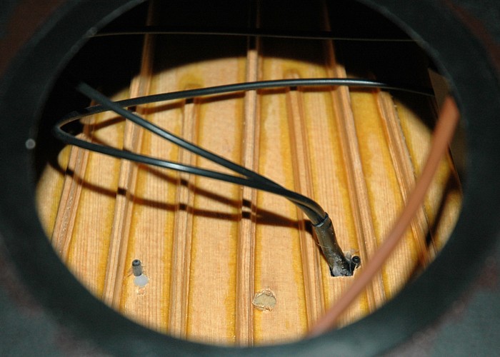My top IS drilled for a stereo pickup, but there is goo in the holes. That sounds like a Tupperware special. Are you sure it didn't start life as a 1537 and someone changed it to straight acoustic? |