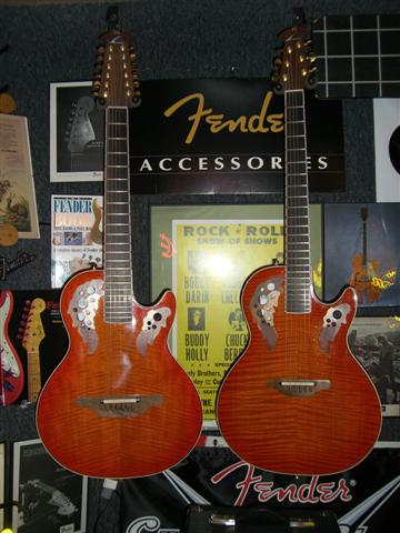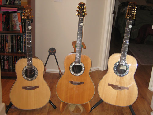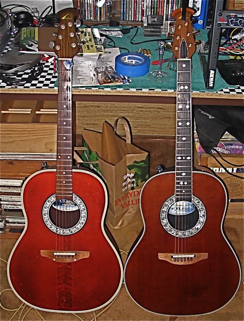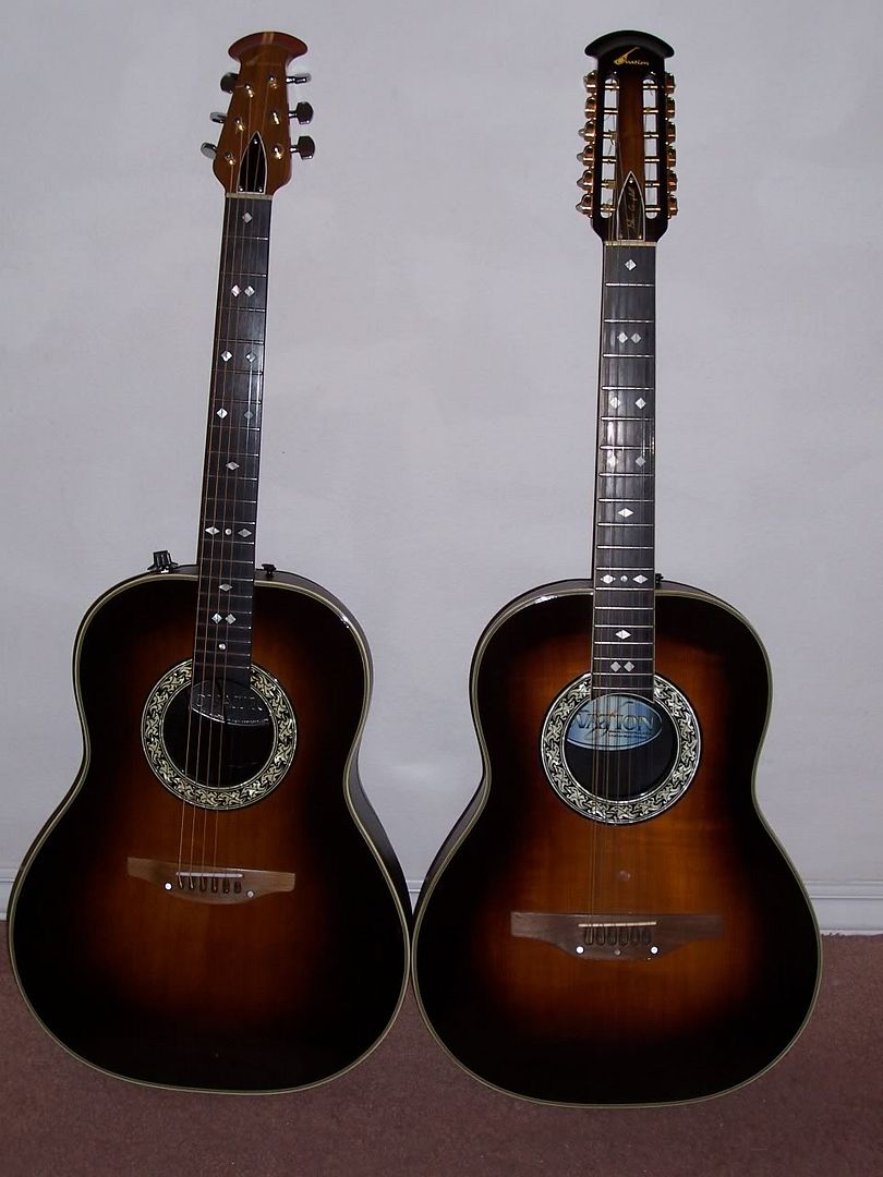 My first Ovation (1983 USA Ultra) ... which is now set up for slide with a tall nut because the Urelite neck bowed beyond playability , and the 1651 Legend Limited (John Lennon reissue) from about 2005.