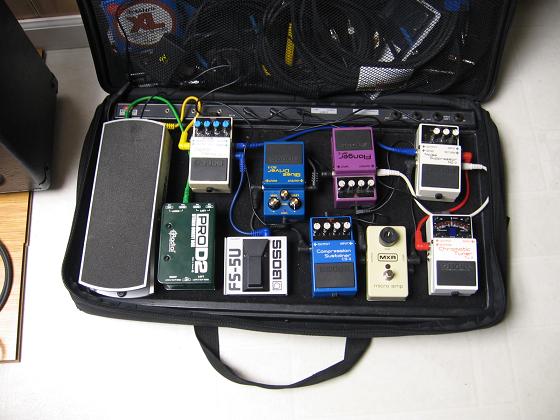 When called for, I add a Dunlop 535Q Wah in front of the board, and for instrumental solo gigs, I add a Boss RC-20XL loop station at the end of the chain. I also have a Trace Elliot SMX dual compressor (thanks for the tip, Matt) en route that will be installed after the tuner.
