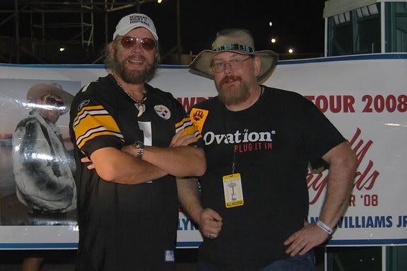 Joined: July 2003 Posts: 3111 Location: Nashville TN. | Well it came and went and was great!!!!!! It was the biggest event I have ever played at. Seeing my name on the T-shirts and being asked the autograph the shirts, was an amazing expirence. Here some Photos!! Marion County Country Music Fest Poster http://i219.photobucket.com/albums/cc285/pezcleo/CEC_radio_poster.j... PEZ Takes the "B" Stage at 215pm on June 13th http://i219.photobucket.com/albums/cc285/pezcleo/pezmccmf2.jpg It was brutally hot and humid, http://i219.photobucket.com/albums/cc285/pezcleo/pezmccmf3.jpg My set included orginals Pinup, Road to Hell, The Luither Song, & Jehad THIS! http://i219.photobucket.com/albums/cc285/pezcleo/pezmcmf1.jpg The Ovation Thunderbolt Served me well!!! My Ole Buddy Mark Barrett takes the stage as Sister Moon at 1245pm on June 13th http://i219.photobucket.com/albums/cc285/pezcleo/sistermoonshine.jp... I did a voice promo for WWQQ on June 12th http://i219.photobucket.com/albums/cc285/pezcleo/wwqq.jpg The "B" stage had a live webcast. http://i219.photobucket.com/albums/cc285/pezcleo/goinglivetv.jpg I was told 14,000 computers on 5 continents were recieving the live stream my performace on June 13. The man from Goinglive.tv said that likily means 18,000 to 20,000 people saw my set via the internet. About a thousand saw it on site live along the pavillion. The "A" Stage being set http://i219.photobucket.com/albums/cc285/pezcleo/astage.jpg I stayed in the "Star Suite" LOL http://i219.photobucket.com/albums/cc285/pezcleo/starsuite.jpg with Hank Jr http://i219.photobucket.com/albums/cc285/pezcleo/photo-full.jpg What can ya say your with a legend He played @ 10pm June 13th Gretchen Wilson was a down to Earth dynamite lady http://i219.photobucket.com/albums/cc285/pezcleo/GWPEZ1.jpg She sincerly wished good luck at my performance. She played June 12th at 10pm Phill Stacey was great guy!! http://i219.photobucket.com/albums/cc285/pezcleo/GWPEZ1.jpg Note he sleave he had changed his clothes 15 minutes before and was starting to sweat through. He played at 630pm on June 14th I also had a photo with Sugerland but I don't have it yet. Man I could used to livin like this. 3 days of being A Star was an amazing feeling. Oh well its back to being no one in Hartford. Press about this event Carolina Entertainment Complex prepares for country music fest http://www.scnow.com/scp/news/local/pee_dee/article/carolina_entert... Country greats to play Pee Dee http://www.scnow.com/scp/entertainment/eight_days_a_week/article/co... Marion Country MusicFest to feature music, amusements http://www.scnow.com/scp/entertainment/eight_days_a_week/article/ma... Stars Align at Country Music Festivals http://www.countryhound.com/Articles/1921/Stars-Align-at-Country-Mu... Otto bringing ‘country soul’ to the Marion County Country Music Fest http://www.scnow.com/scp/news/local/article/otto_bringing_country_s... South 85 Releases Debut Album 'El Camino' http://top40-charts.com/news/Country/South-85-Releases-Debut-Album-... Country singer Ashton Shepherd talks about her meteoric rise http://www.scnow.com/scp/entertainment/eight_days_a_week/article/co... | ||