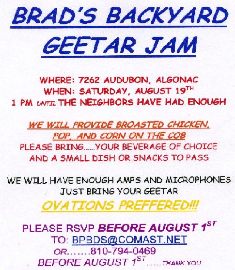 Joined: March 2002 Posts: 14842 Location: NJ | Nice "flyer" Brad! I'm sure that it's been printed in mass quantity and is being posted on every telephone pole in downtown Detroit this very minute . . . . I once threw an outdoor SummerBash at my home and had invited a "select" group of co-workers via an e-mailed, similar "flyer" . . . On the Friday before the party (I had taken the day off to prepare my house/yard), somebody in the office (I would assume "peeved" that THEY weren't invited) printed the flyer and papered the warehouse with it . . . Had about 30 VietNamese and Ecuadorian workers (who spoke not a WORD of English - but were curiosly capable of reading the invite - and finding my house) show up to happily relieve me of a couple of kegs and a goodly part of Frank Purdue's weekly production . . . LessonLearned. | ||