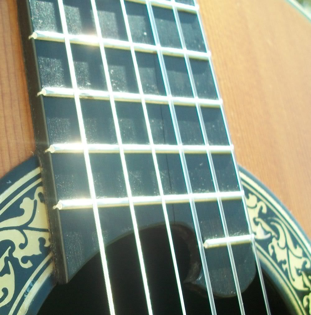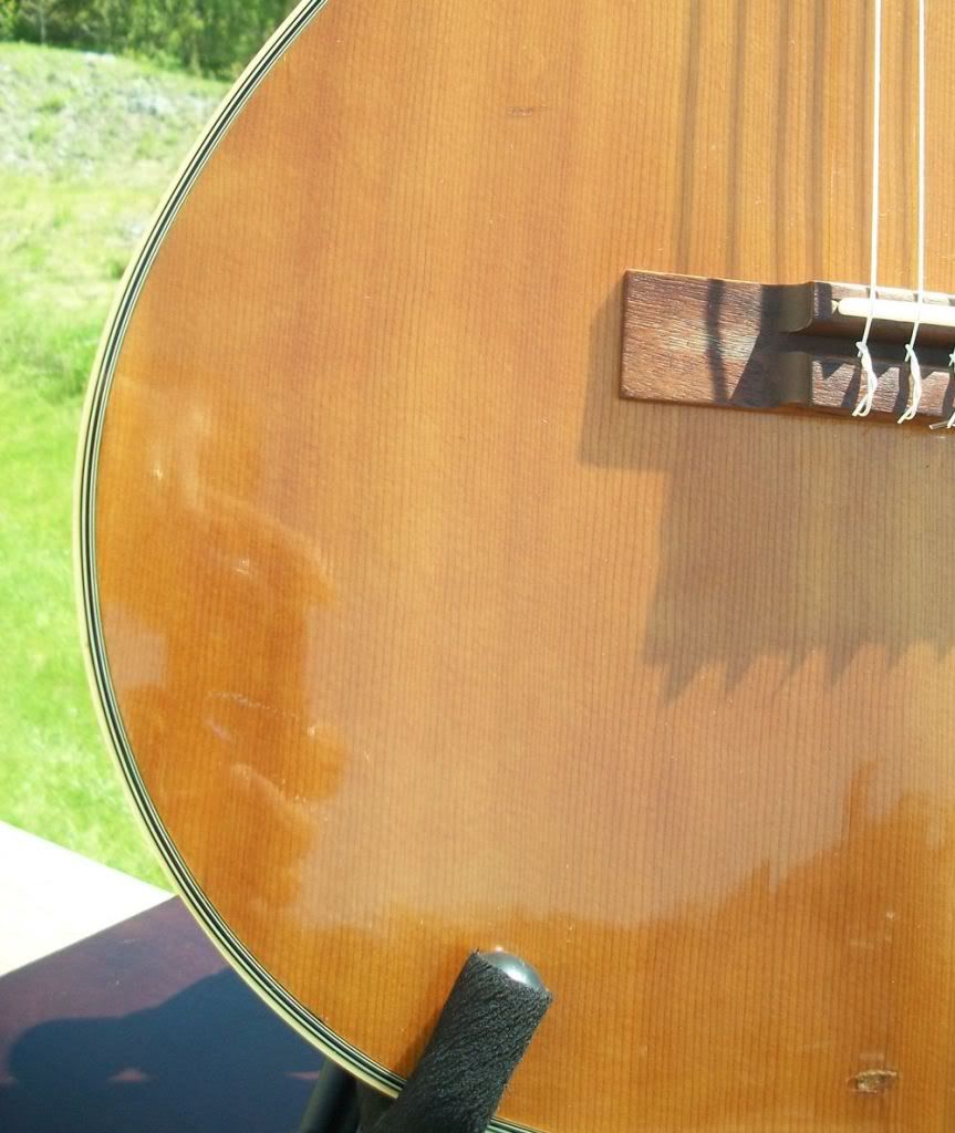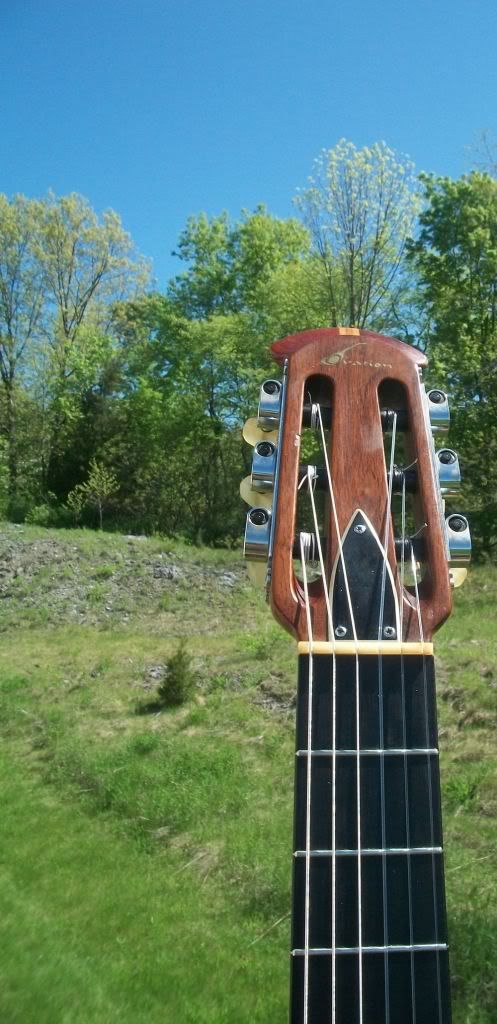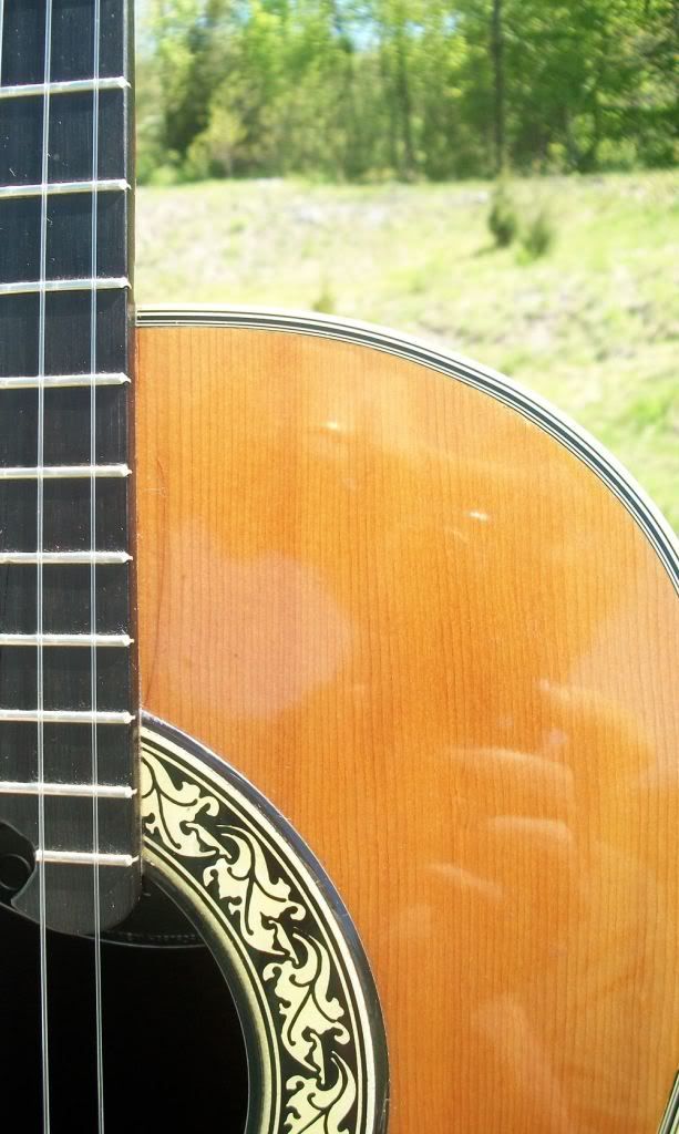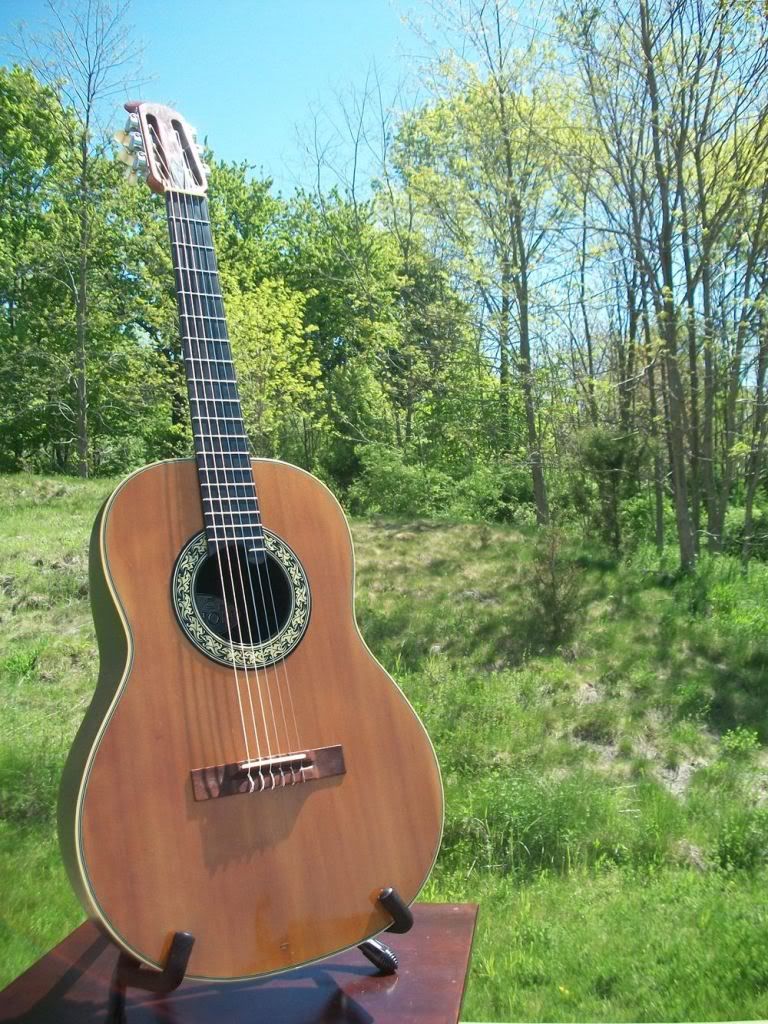 Joined: May 2006 Posts: 4236 Location: Steeler Nation, Hudson Valley Contingent | Ovation Guitars was only five years old when they made this instrument. The Serial number dates it to 1973, so it has thirty-four years of character (AKA dings and nicks), more character (AKA outstanding, mellow tone), and more character (let's just call it MOJO). After three decades, it has some aesthetic issues, but MAN, does it have ti where it counts! I've heard folks say they can take or leave VT-10 bracing, but this one has excellent tone with good bass, balanced trebles, and some serious sustain. The playability is spot on. The action is just fine. Honestly, it is a joy to play and hear. It has quite a few dings and nicks, the worst of which I've tried to get pictures of, but I want to reiterate that the instrument is structurally sound and should continue to be so for a long, long time. It has one finish crack about 2" long right next to the neck, and there is also a small split in the fret-board at the soundhole form where the wood got too dry in the past some time. Otherwise, there are various types of aesthetic imperfections common to older guitars; again look closely at the pics. Since someone is going to ask anyway, here are the basics: it's a spruce topped, VT-10-braced, 12-fret, 2-inch-nutted, non-pre-amped, pleasingly toned bit of solid American craftsmanship. It comes with a non-standard, hardshell case. If you need a good, solid instrument to take anywhere you please and still draw attention to yourself in a good way, this is your guitar! I'm asking $495 including insured shipping in the continental US. I'll ship overseas, but check for a shipping quote and have a seat before you read it. Just remember that this is a player's instrument, not a prom queen. With that in mind, you won't be disappointed. Feel free to ask questions, and be sure to follow the ning link for more pictures. Thanks for looking. Classical Pictures ![]() | ||