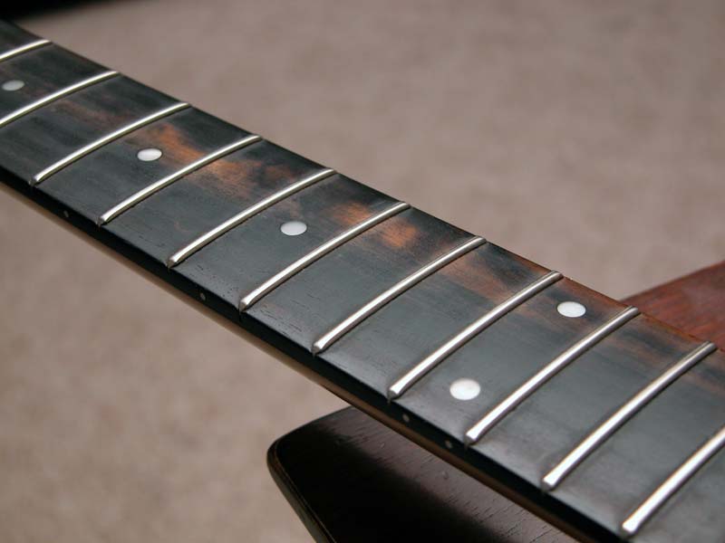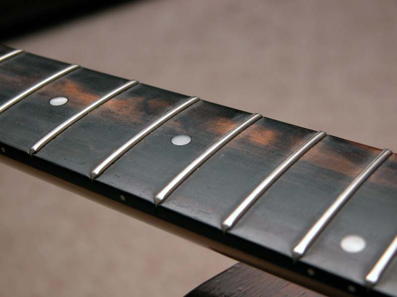 *Discoloration on the fretboard. I assume that because it was a prototype a "non-desirable" piece of wood was used? Or maybe it happened after, but I don't think it would be due to wear as the frets are in excellent condition.
