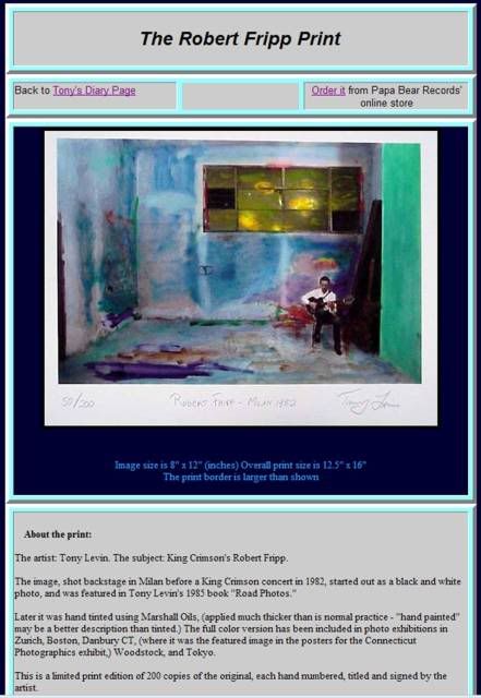Joined: August 2009 Posts: 14 Location: Southeastern PA | Fellow OFCers: In an effort to remain solvent in these difficult global economic times, I have been forced to sell some of my prized possessions. (I've got two O's for sale on the OFC For Sale page.) I'm looking for good homes for my stuff. I became an owner (Custom Legend 1867) and fan of Ovations in the early eighties through Robert Fripp. Here's where I could use your assistance: I am trying to establish a fair asking price for my copy of Tony Levin's "The Robert Fripp Print" (screenshot of original offer below). It is one of 200, with Certificate of Authenticity. My Internet search only resulted in an old auction for a Boston university. I asked Tony if he knew the fair asking price. He did not know. He suggested I post to his Facebook and Fripp's DGM site. No replies giving me guidance. Tony also suggested I put it on eBay. eBay's fees seem excessive. If any OFCers have better Internet chops than I have in finding the latest resale value of the print, I'd appreciate it. Thanks. ![]() | ||