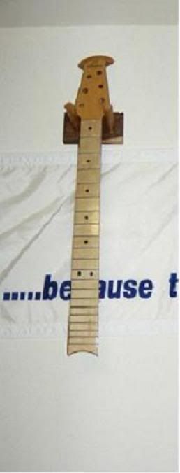Joined: November 2002 Posts: 3666 Location: Pacific Northwest Inland Empire | Given this is probably a one-of-a-kind neck, and it has never been used on an instrument (no holes for the tuner screws); I am waiting for the proper inspiration & enlightenment to osmose. Perhaps this should be a group effort to construct an original BFLG "Commemorative". What we REALLY need is an original Adamas top, and an "idea" preamp. I have a couple of 3-to-4-"A" top sets, and an 18" table-top sander, so there are some possiblities. Anybody got a boatload of abalone? How 'bout a redwood top, & a maple bridge (to match the neck)? Or, the *Dylan BFLG*- "Blonde On Blonde" Lots of prospects, anyway. | ||