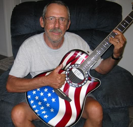 | Joined: December 2006 Posts: 6268 Location: Florida Central Gulf Coast | My ol' venerated and faded 'Stars and Stripes' was replaced yesterday on the flag poll out front. Then today I received one that will NEVER be replaced! I still have geese bumps. This puppy is beyond my greatest expectations. What a fantastic job the MS did on the graphic! Oh heart be still (whoops, at my age that's not funny)... Seriously, this is AWESOME. Patty said, "Oh, that's absolutely gorgeous... It's you... How much was it?" "Ya don't want to know... I've got three other gits for sale...". "OK, I gotta take a pic of you with it"... To bvince, Bryan, yes it's a mid bowl, 4 7/8" depth at the bridge end of the sound hole. Yepper, like you, I'm a deep bowl kinda guy, but c'on... :p AJ, I'd also love to see one with your Southern Cross constellation done as well as this 'un! Presently, I can't accomplish any more pictorial justice than those that you can find on the web. But I'm hoping I can capture what it means to me later... A truly sincere 'thanx' to those that rooted for me during and after my endeavor to find this meaningful 'symbol' and your appreciation of the reason! | ||