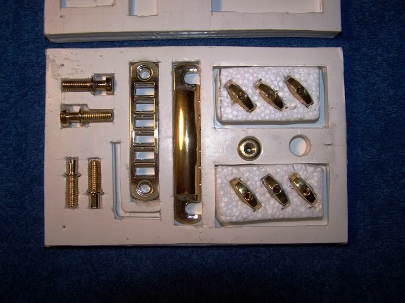 | Joined: December 2006 Posts: 6268 Location: Florida Central Gulf Coast | Damon67 's excellent pic in another thread has prompted me to post a hopefully beneficial thread for some of you. . . . . First of all, many say that a worn finish/plating adds character. I'm not here to dispute nor support that point of view. This post is for those that want to replicate, as closely as possible, an original gold plated appearance. I spent over six months scouring the local establishments and the web for a rea$onable gold re-plating service for my three Korean Sheraton IIs. I finally found a great guy in Texas that accepted the 'challenge'! Here are the before/after pics: Sheraton II: Before After The difference is even more impressive in person. This job was just under a C-note including shipping. Here is the 'custom foam poster board' shipping box I constructed: The pup covers fit over the tuner knobs on the right side. So if anyone would like the gents addy, PM/email me. I honestly thought of being a 'middle-man' but I then thought better in that I don't need any additional projects. I guess I need to let ya'll know that I'm doing this from an appreciation aspect. 'Tex' has never asked me to advertise for him. I'm just a very pleased customer that would like to guide others in need of his services. | ||