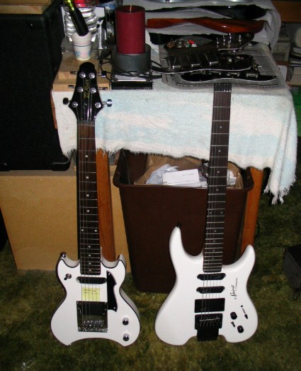 This photo compares a ZZ Ryder MP2 to a Steinberger GU.