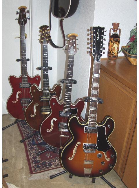 Joined: August 2003 Posts: 4619 Location: SoCal | from left to right (or back to front): K-1240 4-str bass # A-094, 1968 Witko's Thunderhead 6-str # B-108 Tornado-1231 6-str 1968, shortneck # 1222 Wurlitzer 12-str (made by Welson of Italy (1966-68) ![]() | ||