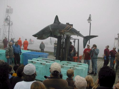 She weighed in at 1035 LBS. It is suspected she followed a weak El Nino current into local waters in search of food. Although mid 60 deg. water is considered ideal for these sharks, the larger ones can tolerate water in the