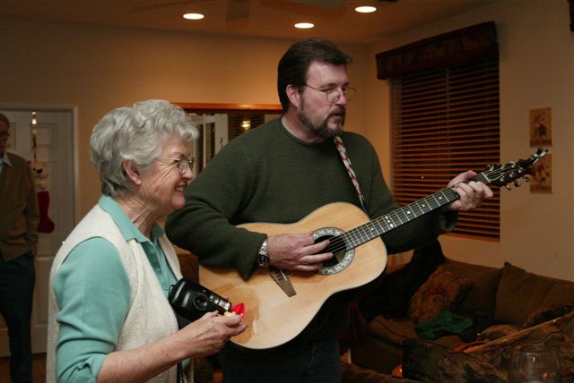 The now pic is from Xmas 2003. I'm 30 years older and the guitar is a 1968 Deluxe Balladeer. Mom is still happy when I play.