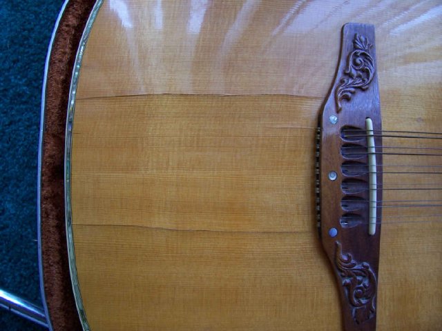 Location: closely held secret | Looks like a third crack is starting at the bridge, which looks like it could let go any time...