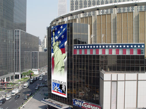 Joined: March 2002 Posts: 14842 Location: NJ | As we "speak", workers are (or should I say "are SUPPOSED to be") installing the four large banners that are the "centerpiece" of the exterior decorations of Madison Square Garden for the Republican National Convention. These were designed by me, submitted to the RNC and were approved for use in various applications, most notably here. ![]() The banners in the picture are a whopping 36-feet wide by 100-feet tall. They're being affixed to the four glass "towers" around the Garden. Two are as you see here, and the other two have the flag background but without Lady Liberty. This picture was taken (by me) from the northeast corner of the roof of the Farley Post Office across the street from the Garden (which provided a bit of a "crotch-twitch" as there was no railings up there at the time). The banners and other decorations were PhotoShop'd in as part of the presentation process. Madison Square Garden has always been a very special place to me (as I mis-spent a LOT of my youth there :-) and I am somewhat proud that my work has been chosen to temporarily adorn it (politics aside). Where else but in this great country can a guy who's been given this honor be the same schmuck that put Paul Hebert in a dress?? y'GOTTA LOVE this Country!! (I know I do) Please forgive this not being an Ovation/guitar/music post, but this is about as CLOSE to "Playing the Garden" as I'LL ever get!! ;) | ||