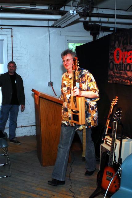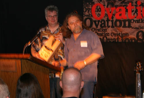 Joined: September 2003 Posts: 9301 Location: south east Michigan | From the start Paul Templeman has been a "Be There" kind of guy. It seems a though he is always lurking... just waiting for a chance to pounce and be helpful with any techical question. And they are seldom short, quick answers. A number of times over the last 3 tours I have seen Paul respond to a question by giving a virtual mini-lesson in alternate tunings or slide technique. And needless to say, there is not a bigger promoter of the Ovation brand out there. We had a little fun at the presentation. We made it seem as though Cliff had won. Cliff accepted the applause, got up to the podium, removed the ribbon covering the name plaque and said... "Hey.. this isn't my f%&$ing name on this thing!!!" | ||