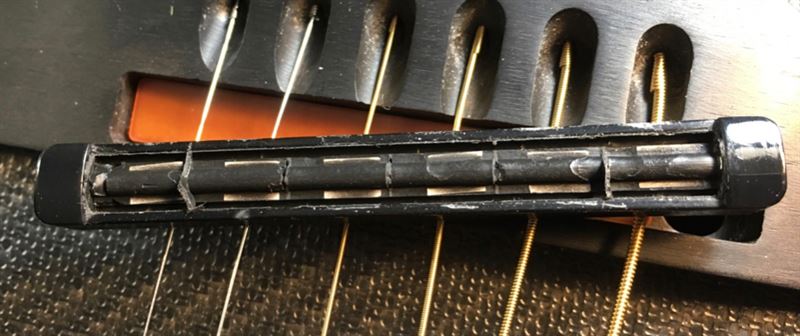 Joined: June 2012 Posts: 2340 Location: Pueblo West, CO | FlySig - 2019-02-09 6:01 PM Good results so far with replacement saddles. Peeling off the original plastic saddle really is easy, and the new saddle completely solves the low E intonation problem. 1) No discernible tonal difference with the white saddle in the 1537 compared to the factory original. It dropped right in easily after removing the original saddle. Great news! FlySig - 2019-02-09 6:01 PM 2) The stereo pickup in the 1537 has an interestingly different construction with copper tape along the top surface rather than soldered wires. Being stereo, there must be 2 wires on the bottom of the piezos. This is a late Fender era replacement, not the 1983 original. http://www.ovationfanclub.com/megabbs/photos/get-photo.asp?photoid=7282 That's interesting. I've never seen the inside of a stereo pickup. FlySig - 2019-02-09 6:01 PM 3) The black replacement saddle for the 2080 is not sitting totally flush at the 6th string. The saddle is .011" longer than the original, and there is an excess of RTV/silicone inside the pickup. With some filing of the saddle and trimming of the silicone it fits laterally but is still not flush at the 6th string. I believe there is still some excess silicone, and possibly the silicone is off center along the piezos. It trims off very easily with an X-Acto knife. Acoustically it sounds normal but plugged in there is almost no signal from the low E string. With a bit more careful trimming of the silicone I think this is going to work fine. http://www.ovationfanclub.com/megabbs/photos/get-photo.asp?photoid=7283 http://www.ovationfanclub.com/megabbs/photos/get-photo.asp?photoid=7284 Have you been able to compare the old saddle to the new one to determine if they are identical? How does the old one fit into the pick-up? Given that the new one shares idential dimensions with the OEM, there must be a reason why it's not settling into place. FlySig - 2019-02-09 6:01 PM 4) I would love to have an off-white color that looks like unbleached aged bone rather than the bright white. I've still got one white nylon saddle I got from Shapeways. I've had good luck antiquing other plastic stuff with Rit dye. I'll give it a try and let you know how it works. FlySig - 2019-02-09 6:01 PM 5) When retuning the strings, eyeball their position carefully over the new saddle so that they are properly spaced. Once up to pitch they will create a small notch in the saddle, so spend the few seconds to get it right. I agree and have done the same myself when tuning up my strings on the new saddles. FlySig - 2019-02-09 6:01 PM 6) Someday I'll figure out how to post pictures on this forum so that they display. Jeez. 1) Open a new tab in your browser. You should have two tabs open -- one for the comments and the other, images. In the comments tab, click the Use Rich Text Editor button. 2) View the image in a browser. Right-click on the image, then select Copy Image Location from the pop-up menu. This will store the URL into the clipboard.