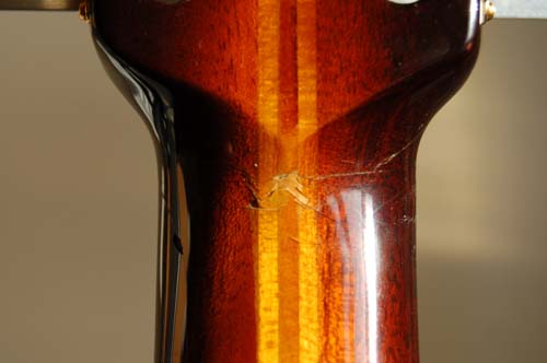 Joined: March 2007 Posts: 698 Location: Cork, Ireland | Also found some cracks at the headstock/neck junction - see my gallery for pics. Could these be just in the varnish? Hopefully? There's no sign of movement between the headstock and neck and it stays in tune OK. Also posted a pic of the bridge showing the missing Black Thingy on the right. | ||