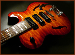 Joined: November 2003 Posts: 11039 Location: Earth·SolarSystem·LocalInterstellarCloud·Local Bub | Jol Dantzig- he had a little Get-Together. I crashed the party until he realized I wasn't actually Rick Nielson... Specs: Top: carved ultimate grade quilt maple Back & Sides: honduras mahogany Trim: cellulose "tortoise shell" binding Fingerboard: brazilian rosewood Inlay: 30 genuine pearl Pickups: 3 black P90s Tailpiece: Bigsby Finish: deep lacquer gloss Tuners: Schaller Nut: hand shaped bone | ||