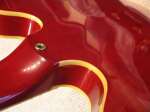 Korean made Hollow body guitar Kaman GTX 35, similar in style to the Gibson ES 335. The GTX-35 has a laminated mahogany back & sides and a laminated spruce top. The neck is maple with a rosewood fingerboard. The pickups are generic pickups designed for GTX guitars. This model was available in the late 80s/early 90s. It had a list price of $499.00.